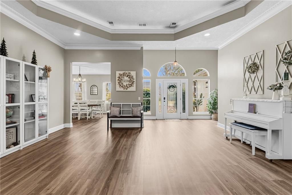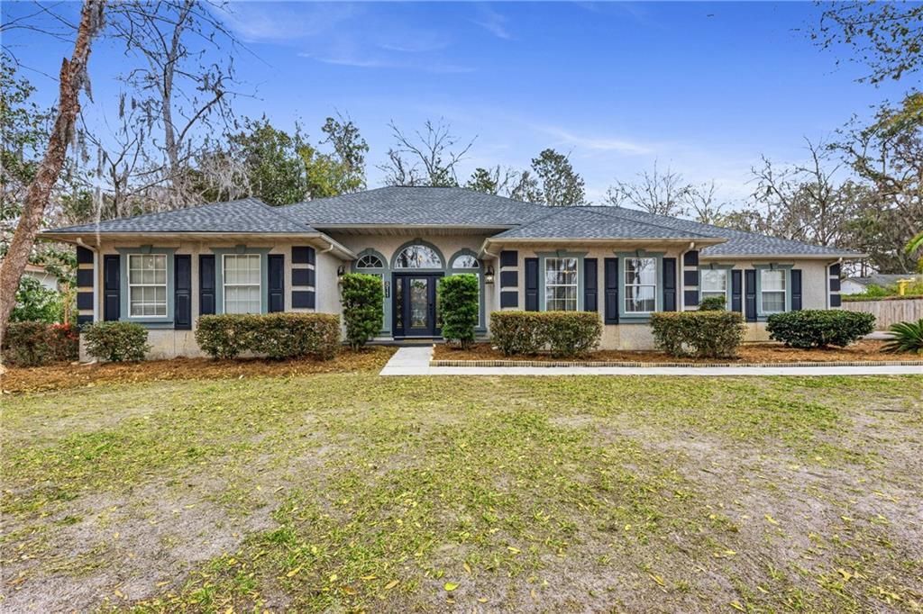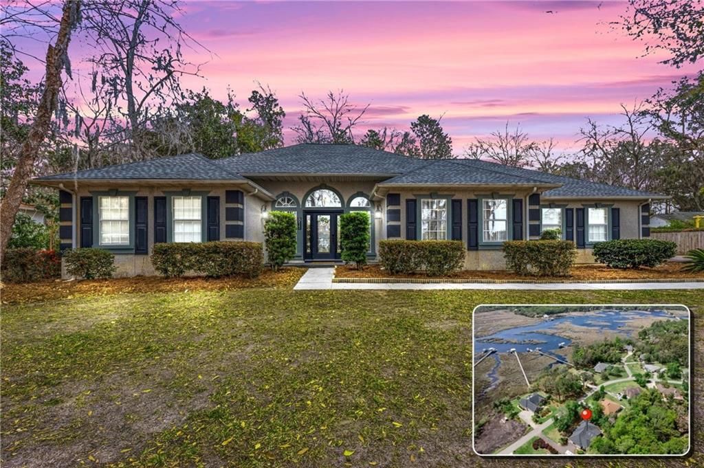 Welcome to 811 Riverview, located in the desirable golf cart district of St. Marys with peek-a-boo marsh views across the street and convenient access to historic downtown. This 4 bedroom, 2.5 bath home is defined by architectural ceilings, natural light, and expansive sightlines that carry throughout the open floor plan. A bright foyer with floor to ceiling windows and a coat closet creates an inviting entry. The formal spaces include a spacious great room and a separate formal dining room. The great room features a recessed tray ceiling with accent lighting within the tray as well as recessed lights, adding warmth and dimension. The formal dining room is distinguished by a modern farmhouse style round chandelier suspended from a recessed dome ceiling, creating a striking focal point. While separate, the dining room remains visually connected to the family room through the open layout and kitchen, enhancing the home’s strong visual flow. The family room showcases a vaulted ceiling with skylights and tall windows flanking a decorative fireplace with built in bookcases and sitting nooks beneath the windows. It is a light filled space designed for gathering and everyday comfort. The kitchen offers quartz composite countertops, white cabinetry with pull out organizers, matching appliances, and solar tube lighting for added brightness. New luxury vinyl plank flooring runs through the main living areas for a cohesive and updated look. Pocket doors between the kitchen and formal dining room maximize space and functionality. The split floor plan provides privacy, with the primary suite located on one side of the home and three additional bedrooms on the opposite side. One guest bedroom features double French doors opening to the family room, making it ideal for a guest suite or home office. The remaining bedrooms offer generous storage and share a well appointed hall bath with double vanities and a separate water closet. The primary suite includes a spacious bath with double vanities, a jetted tub with chandelier above, separate shower, private water closet, and an oversized walk in closet with built ins. A pocket door between the primary bedroom and bath enhances both privacy and efficiency. Outdoor living includes a screened porch and adjoining deck overlooking the shady back yard. A new roof adds peace of mind, and additional features include a 12x12 storage shed and an oversized side entry two car garage with attic access. With architectural detail, abundant light, thoughtful design